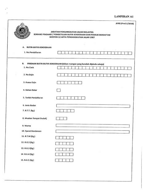 JPJK8_PIND 1 2016 adalah satu dokumen yang amat penting bagi pemilik kenderaan bermotor di Malaysia. Dokumen ini merangkumi pelbagai aspek berkaitan kenderaan, termasuk pemilikan, pendaftaran, lesen memandu, insurans, pembaikan, dan pemeriksaan kenderaan. Pemilik kenderaan di Malaysia harus memastikan mereka memahami dan mematuhi semua peraturan dan syarat-syarat yang dinyatakan dalam dokumen ini untuk memastikan keselamatan dan kesejahteraan semua pengguna jalan raya di negara ini.
